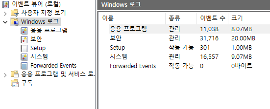 그럼 이벤트 뷰어 창이 열리며 왼쪽에 디렉토리 목록에서 Windows 로그를 클릭한다.