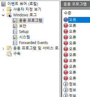 Windows 로그 하위 목록에 응용 프로그램을 클릭하면 애플리케이션 에러를 볼 수 있으며 에러 목록 중 한 개를 클릭하면 하단에 자세한 정보가 나타난다.