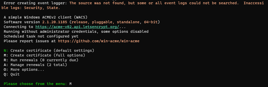 우리는 처음이기 때문에 M을 눌러 인증서 첫 생성을 해준다.