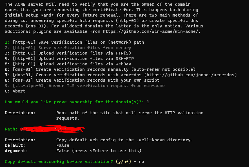 그럼 Path를 입력하라고 할텐데 도메인의 root 위치를 입력하면 된다. 그리고 web.config 파일을 만들거냐고 물어보는데 저장하지 않을 것이기 때문에 no 입력