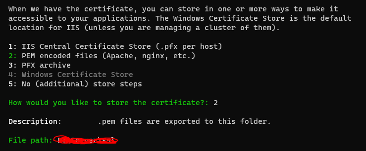 저장할 파일과 저장할 파일 경로를 입력해줘야하는데 2를 입력하고 File Path에 .pem 파일을 보관할 디렉토리 위치를 입력하자.