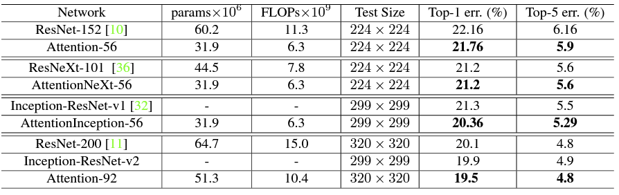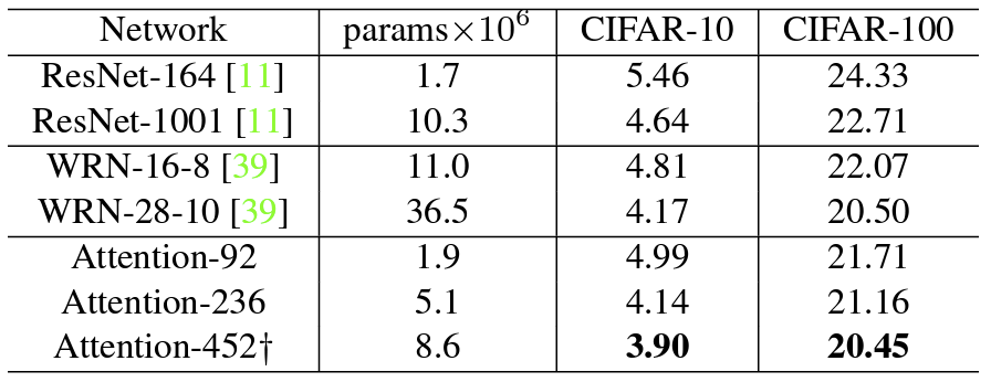 Attention Network는 CIFAR 데이터셋에서 기존 SOTA 모델보다 연산량도 적으면서 더 적은 에러율을 보여줬으며 ImageNet 데이터셋 대해서도 낮은 val error rate를 보여줬다.