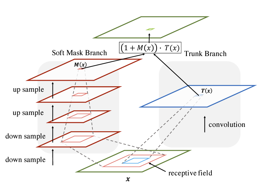 다음으로 Soft Mask Branch는 최소 해상도까지 Max Pooling으로 Down Sampling하여 강한 특징만을 살아남게 한 다음에 Bilinear Interpolation으로 Up Sampling을 진행해 Trunk Branch의 Output인 T(x)와 같은 사이즈로 만들어 M(x)과 T(x)를 곱한다.