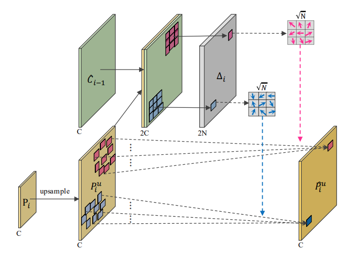 FAM 과정은 [그림 7]에 나온 것과 같고 up sampling 결과는 P이고 low-level에서 넘어온 output은 C이며, offset을 학습하기 위해 C와 P를 concat해 델타i를 출력하고 델타i와 P를 학습해 layer의 output인 ^P를 출력한다.