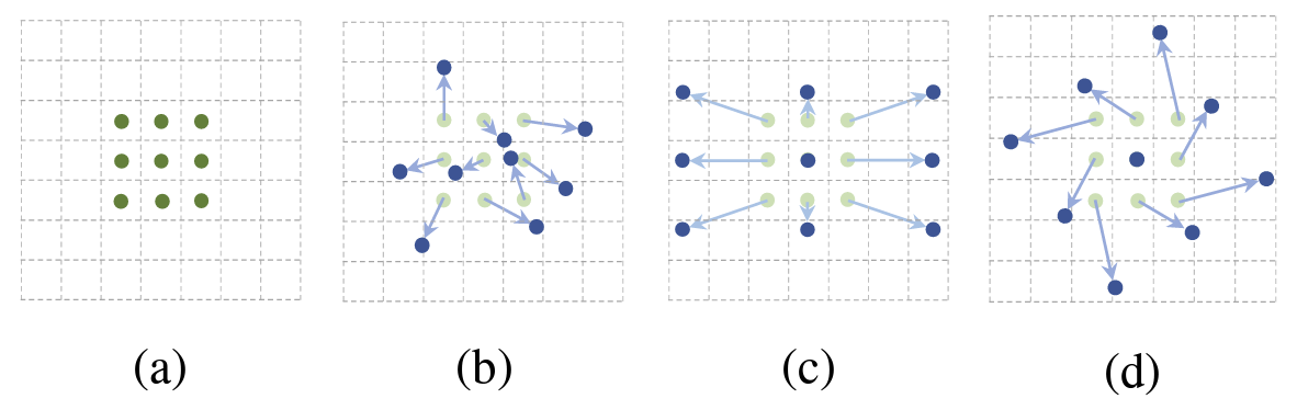 일반적으로 학습을 할 때 [그림 4-a]와 같이 고정된 픽셀을 가져와 연산을 수행하는데 Deformable Convolution은 [그림 4-b] ~ [그림 4-d]와 같이 필요한 픽셀을 가져와 유동적으로 학습을 진행한다는 아이디어이다.