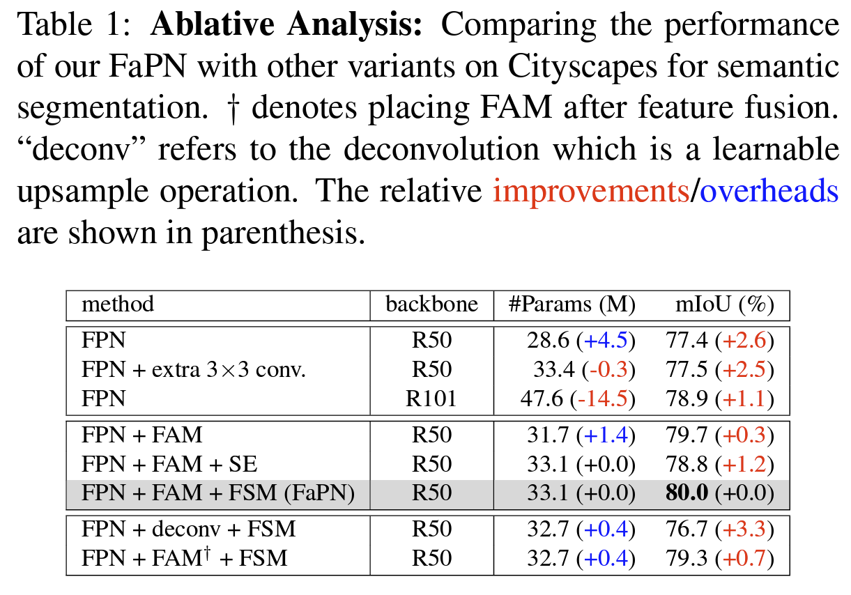 Ablation Study는 인공지능 분야에서 여러 모듈을 붙여 보거나 없애 보며 성능을 비교하는 거라 생각하면 되며, FaPN은 FPN에서 FAM과 FSM이라는 모듈을 추가한 것이기 때문에 FAM, FSM, SE Block, Deformable Conv를 붙었다 떼며 실험해본 결과, 제안하는 FaPN이 가장 좋은 성능을 보여줬다.
