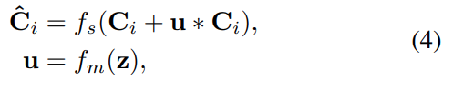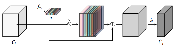 (4)에서 z는 squeeze한 GAP 결과이며 f_m()을 통해 u를 출력 받고 u와 C_i를 곱한 후 identity를 받아 1x1 conv를 통해 high-level과 차원 크기를 맞춘다.