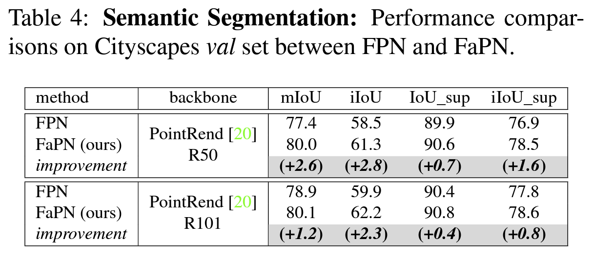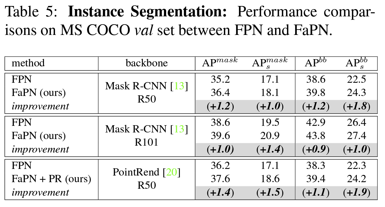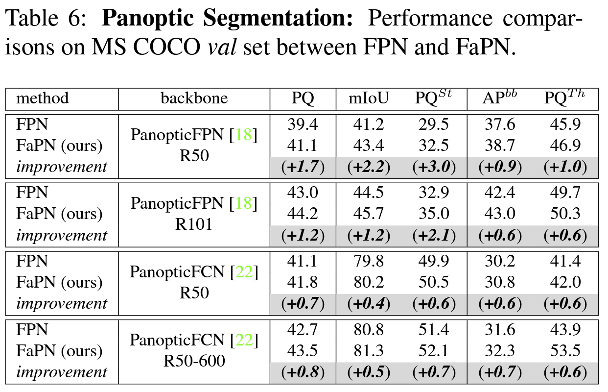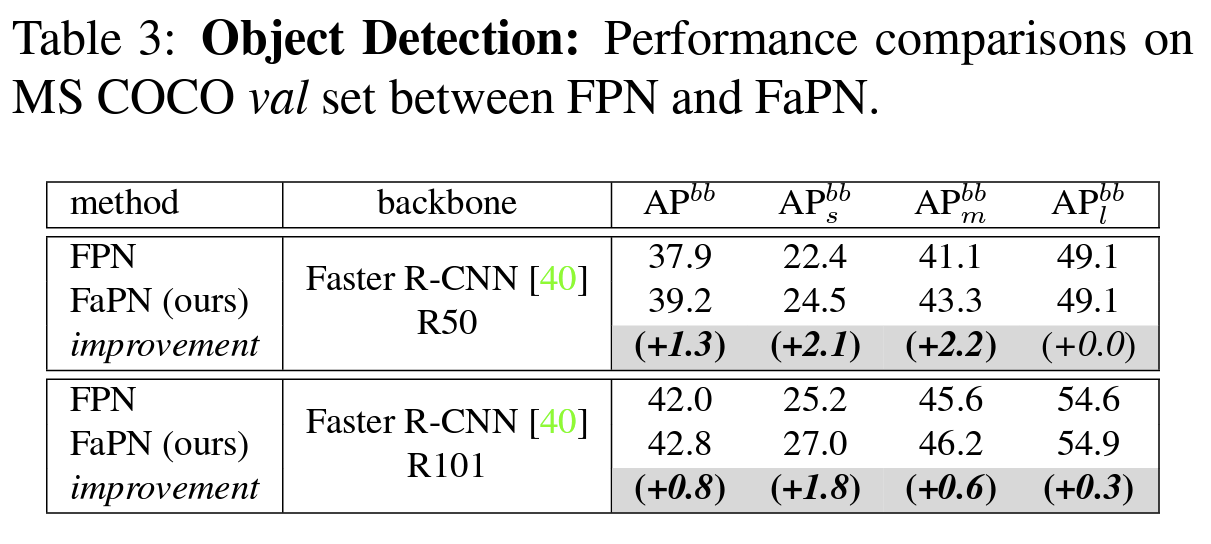 FaPN을 FPN과 비교했을 때 Object Detection, Semantic Segmentation, Instance Segmentation, Panoptic Segmentation에서 FaPN이 더 좋은 성능을 보였으며 특히, Object Detection에서 AP_s가 +2.1, AP_m이 +2.2의 성능을 보여줬다,