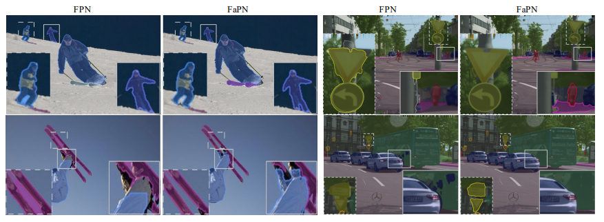 [그림 1]과 같이 FPN 같은 경우에는 Feature Misalignment 문제가 있어 경계선을 확대해서 봤을 때 모호하게 Segmentation 된 걸 볼 수 있지만, FaPN 같은 경우에는 FPN 보다 경계선에 있어서 제대로 Segmentation을 하고 있다.