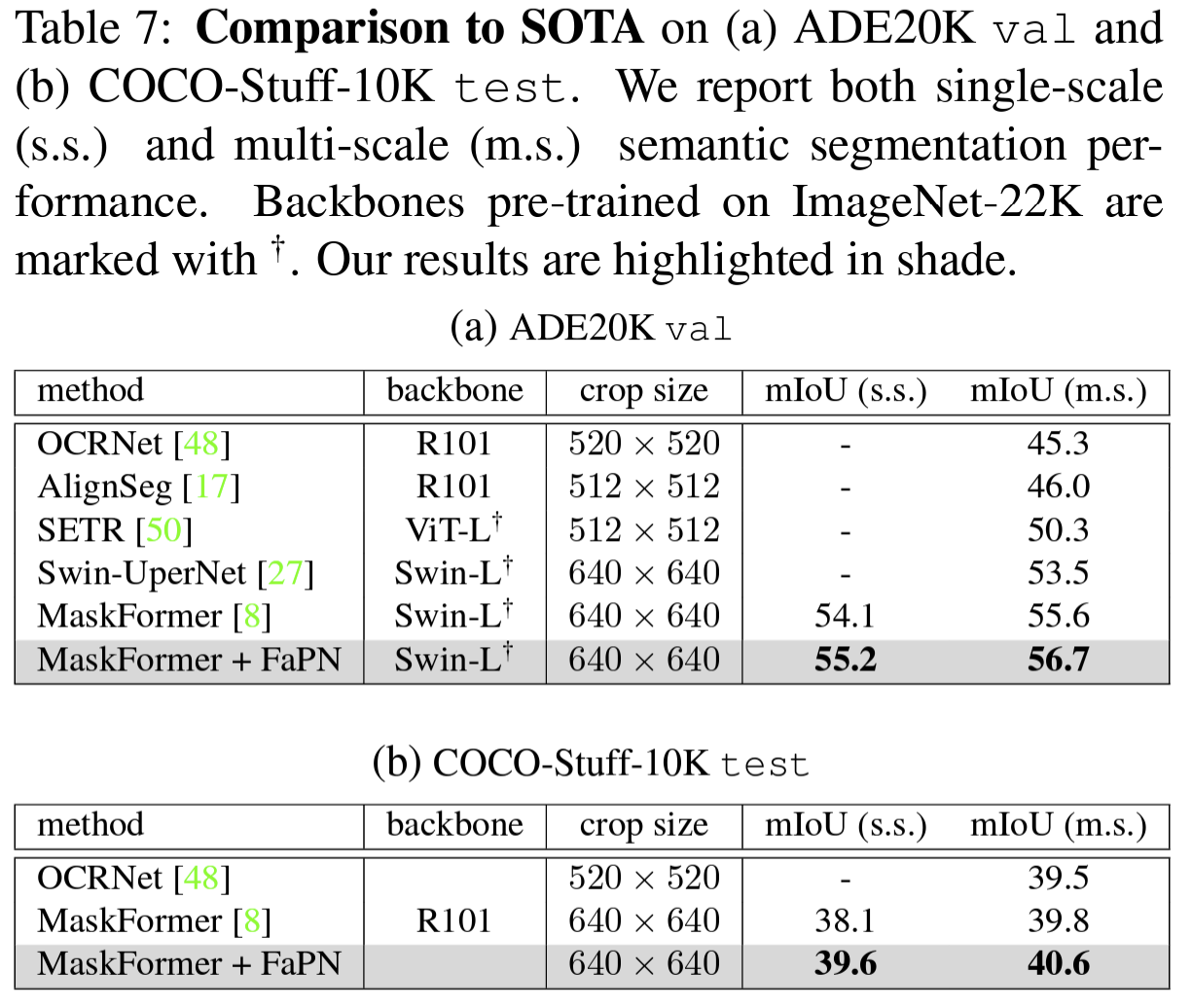 또한, FaPN은 ADE20K val에 대해서 SOTA를 달성했다.
