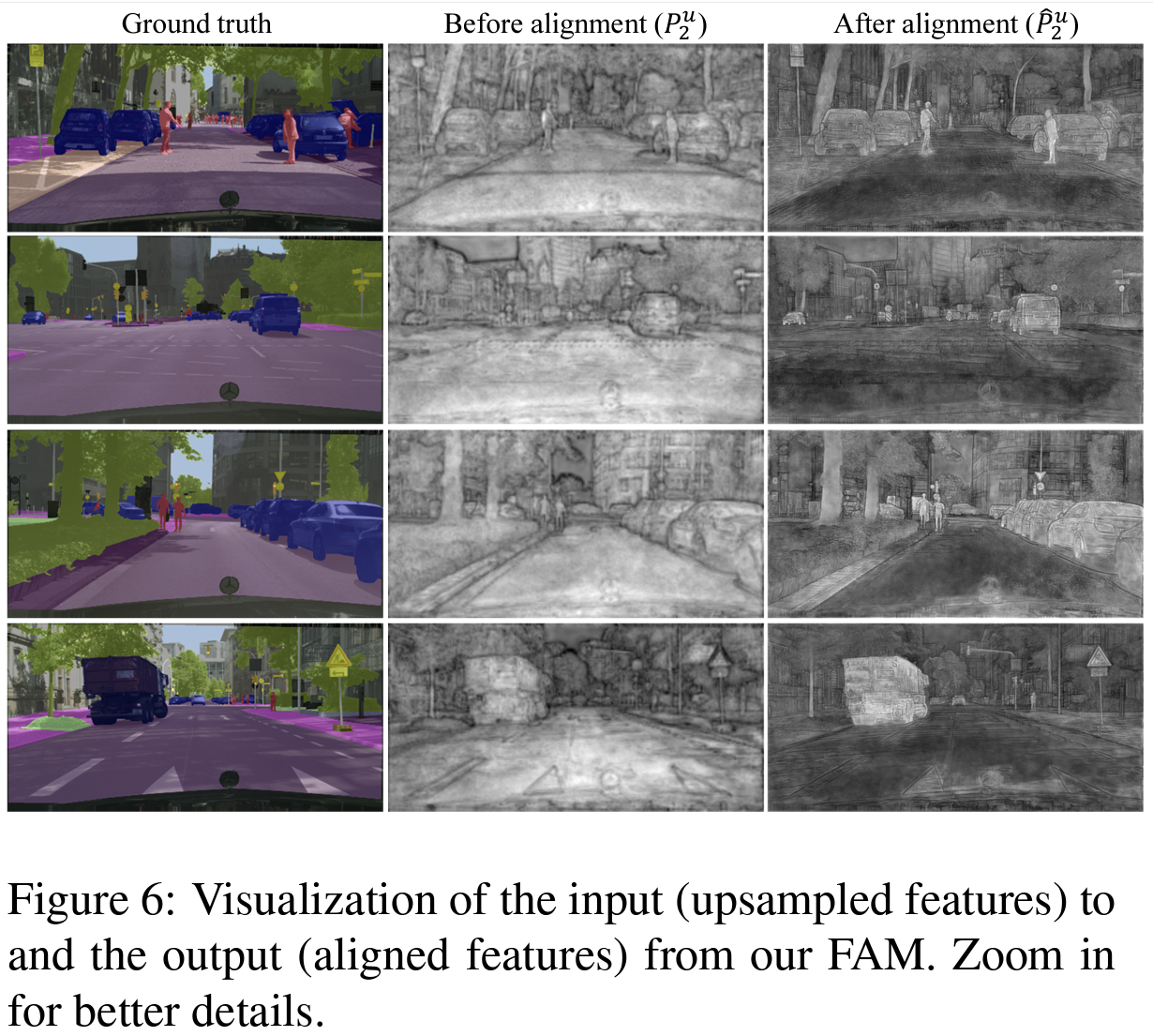 확실히 Image를 봤을 때 FAM을 적용하지 않은 P보다 FAM을 적용한 ^P가 경계선이 제대로 잘 그려져 명확하게 사물이 구분되는 걸 확인할 수 있다. up sampling 되는 과정에서 2x up한 결과를 FAM에 넣기 때문에 FAM 적용하기 전이 Before alignment로 P이며, 적용한 후가 After alignment인 ^P인 것 같다.