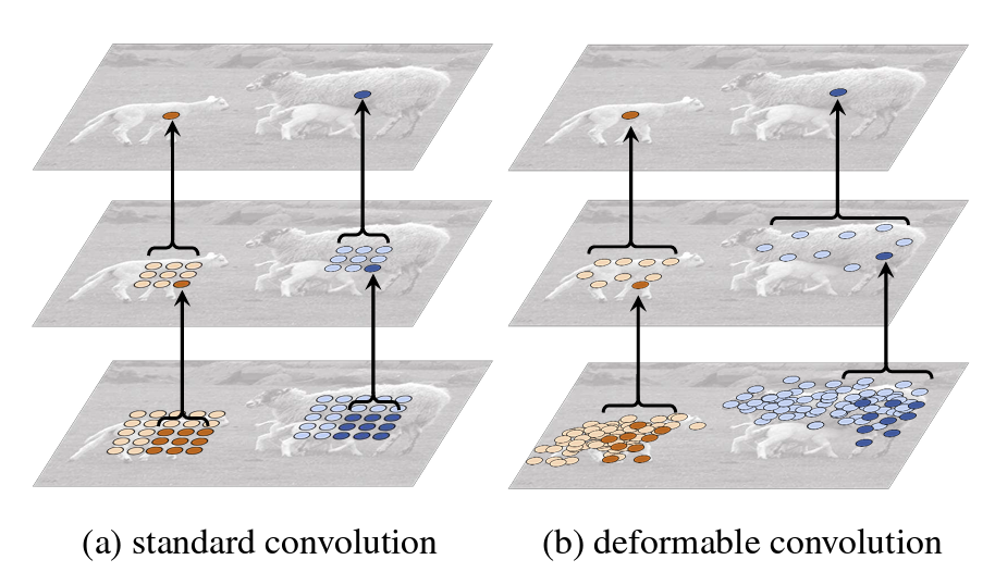 결과적으로 object 상관없이 고정된 윈도우에서 학습을 진행하는 일반적인 [그림 6-a]와 달리 object에 맞춰 유동적으로 deformable convolution의 학습 과정은 [그림 6-b]와 같다.