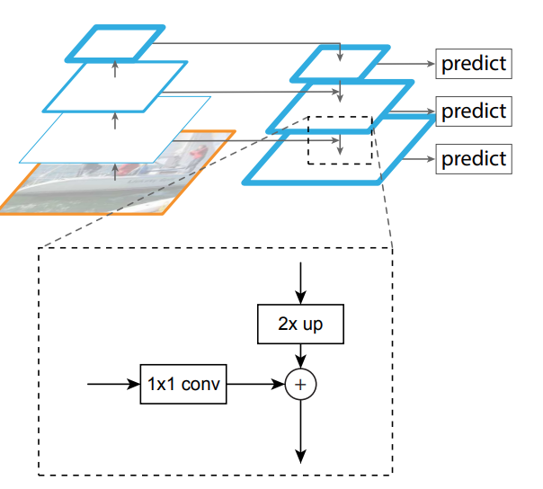 baseline으로는 FPN[2]을 사용하고 bottom-up은 down sampling하는 과정(low-level)이고 top-down은 up sampling하는 과정(high level)이며 feature map i와 다음 feature map i+1을 up sampling하여 이 두 개를 더해 새로운 P_i를 만들어낸다.