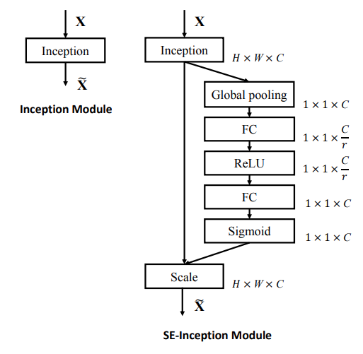 그래서 위에 설명한 SE Block은 쉽게 탈부착이 가능해 [그림 9]와 같이 간단하게 적용 가능하며 왼쪽은 Inception 모듈, 오른쪽은 ResNet 모듈에 SE Block을 넣은 모습이다.