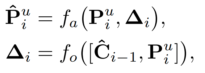 위에 말한 과정을 식으로 표현하면 (1)과 같고 [그림 2]에서는 C를 기준으로 C는 i번째, P는 i+1번째였지만, (1)에서는 P를 기준으로 해 C가 i-1번째, P가 i번째인 것이며 low-level output이 C, high-level output이 P이며, 델타i는 offset 학습 결과이고 ^P는 최종 출력이며, fa()와 fo()는 offset을 학습하는 function이다.