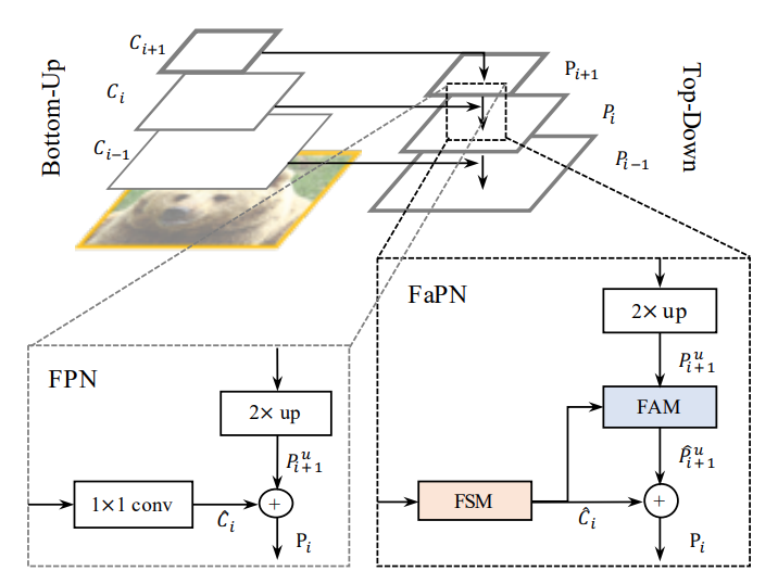 논문에서 제안하는 FaPN은 FPN 그대로 사용하며 두 개의 모듈을 추가적으로 사용했는데 low-level에서는 Feature Selection Module (FSM), high-level에서는 Feature Alignment Module (FAM)을 추가했다.