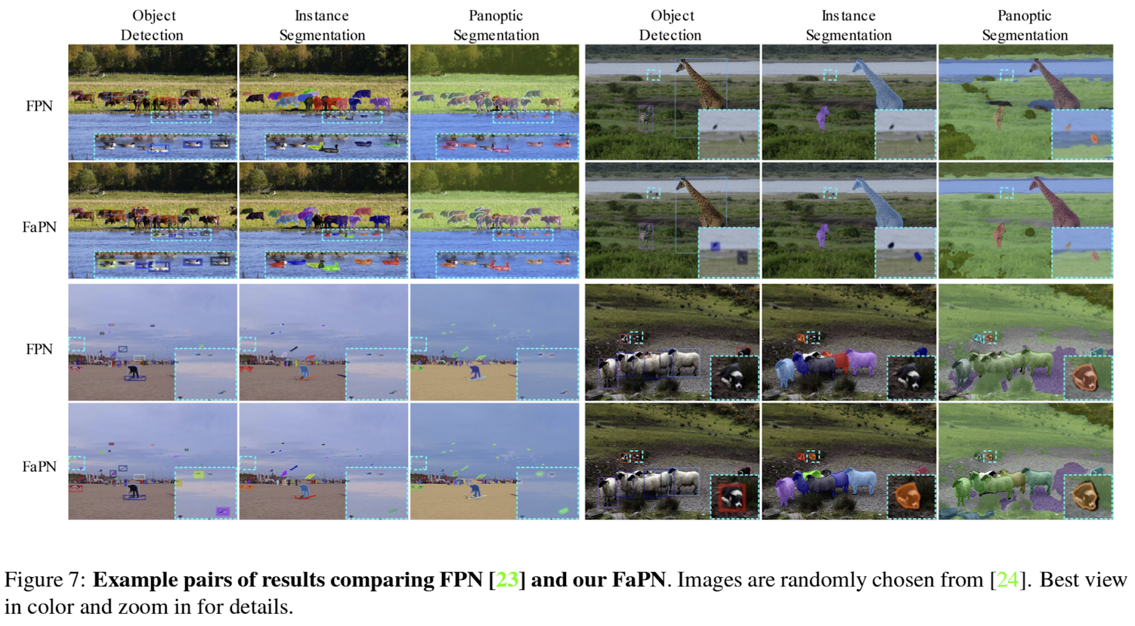 FaPN을 FPN과 비교했을 때 Object Detection, Semantic Segmentation, Instance Segmentation, Panoptic Segmentation에서 FaPN이 더 좋은 성능을 보였으며 특히, Object Detection에서 AP_s가 +2.1, AP_m이 +2.2의 성능을 보여줬다,