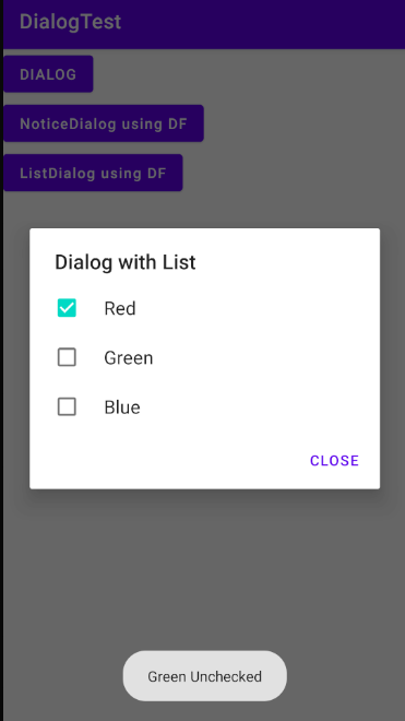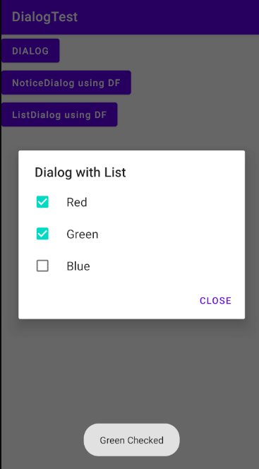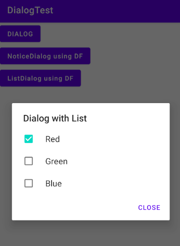 Item List를 통해 Dialog에 리스트, 라디오 버튼, 그리고 체크 박스를 손쉽게 추가할 수 있다. Dialog Fragment에서 했던 것처럼 클래스의 자식 객체를 만들어 설정해준다. (생성과 관리를 별도의 영역에서 진행)