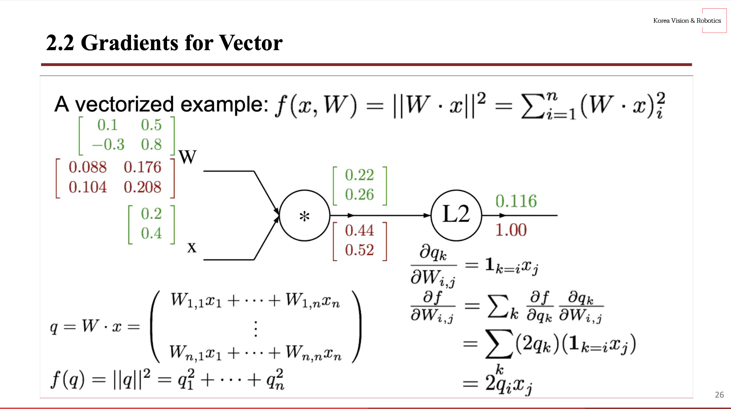$q = Wx$이기 때문에 편미분 결과는 $x$이다. 그럼 $W$의 global gradient는 $2qx$인데 (2, 1) * (2, 1)이라 shape이 맞지 않는다. 따라서 $2qx^T$로 바꿔서 계산을 해주면 (2, 2) 크기의 global gradient 값을 얻을 수 있다.