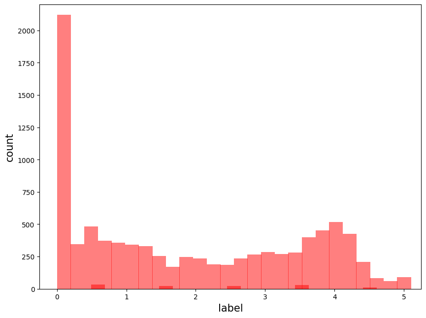 label은 0~5 사이의 실수인데 분포를 보기 위해 시각화 해본 결과 train data에 대해서는 0에 편향되어 있고 val data는 골고루 분포되어 있다.