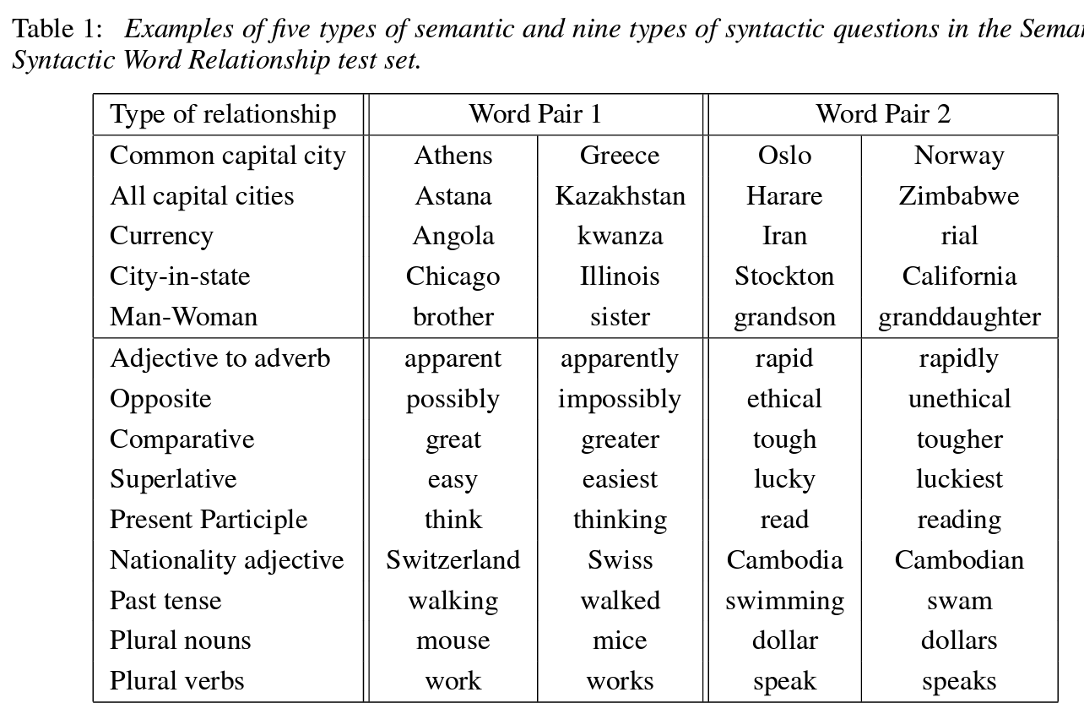 Table 3은 인공신경망 기반 모델은 NNLM, RNNLM, CBOW, Skip-gram의 성능을 비교한 표이다. 논문에서 제안하는 CBOW와 Skip-gram은 기존에 있던 NNLM, RNNLM보다 훨씬 좋은 성능을 보이며 Skip-gram은 일반적으로 준수한 성능을 나타내며 Syntactic Accuracy에 대해서 CBOW가 Skip-gram보다 앞선다.