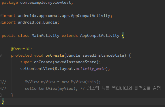 MyView.java(이하 커스텀 뷰)를 만들어 액티비티 화면으로 설정해 실습을 해봤습니다. 커스텀 뷰에서 터치 이벤트가 발생했을 때 (x, y)를 읽어와 안내하는 문자열을 출력했습니다.