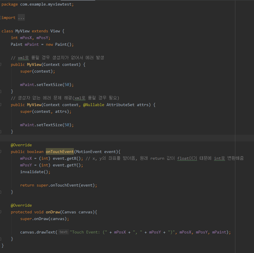 onDraw() 메소드는 단순히 화면에 안내 문자열을 쏴주는 메소드이며, onTouchEvent() 메소드는 터치 위치를 int값으로 전송합니다.