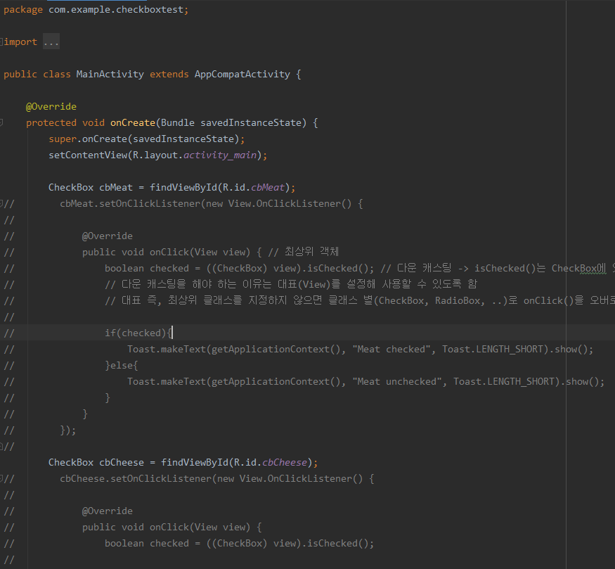 왜냐하면 isChecked() 메소드는 CheckBox 클래스에 있는 메소드인데 onClick() 메소드는 View v라는 뷰 객체만 받습니다. 1차원적으로 생각하면 CheckBox 클래스의 객체가 없으니 isChecked()를 못 쓰겠구나... 겠지만, View 클래스는 모든 뷰의 최상위 클래스이기 때문에 (CheckBox)로 다운캐스팅해줘 isChecked() 메소드를 호출해오는 것입니다.