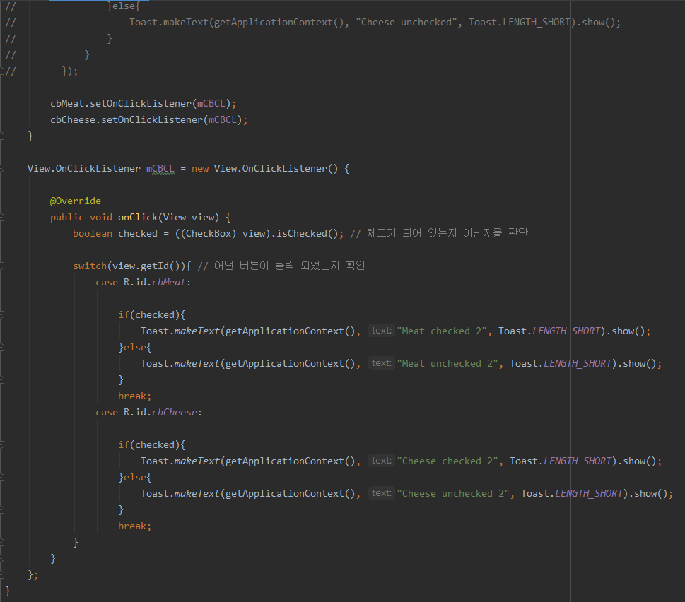 그럼 체크 상태까지 알았으니 switch()를 통해 클릭된 뷰를 확인하고 checked의 상태에 따라 Toast를 출력해주면 됩니다