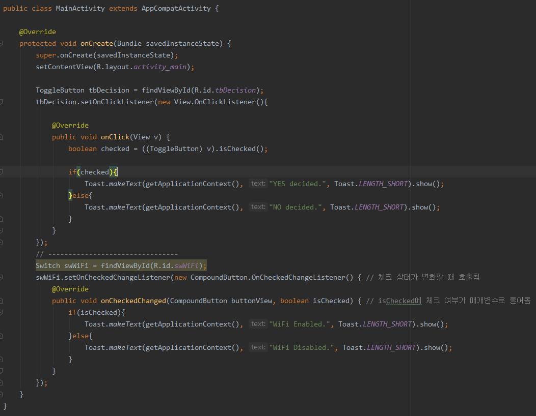 Switch는 상태 변경 리스너에서 CheckBox, RadioButton, ToggleButton처럼 isChecked()로 현재 상태를 가져 올 필요가 없다. 그렇기 때문에 매개변수에 잇는 boolean 타입의 isChecked만으로 Switch가 On || Off 인지 판단이 가능해 동작문만 알맞게 작성해주면 된다.