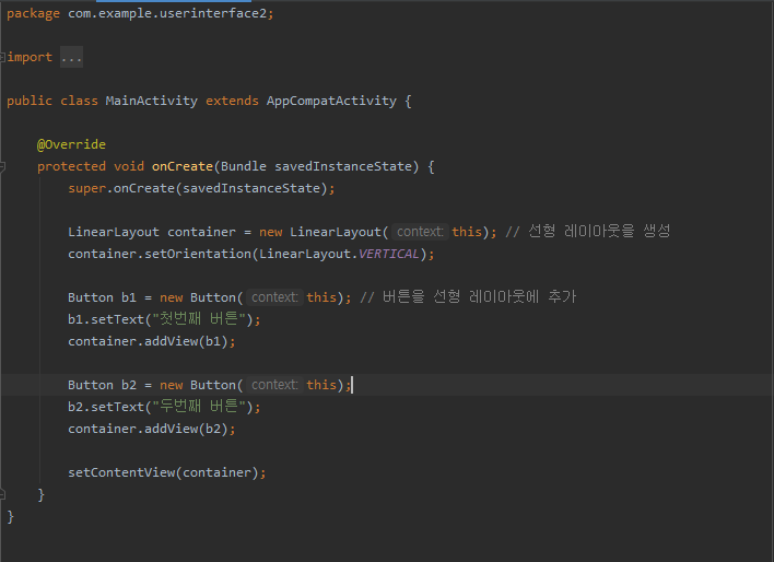 LinearLayout 클래스의 객체인 container를 만든 후에 뷰를 addView() 해준다.